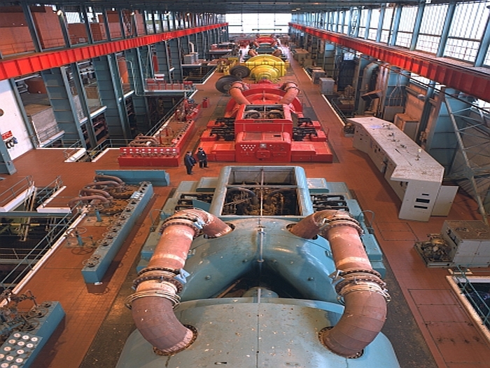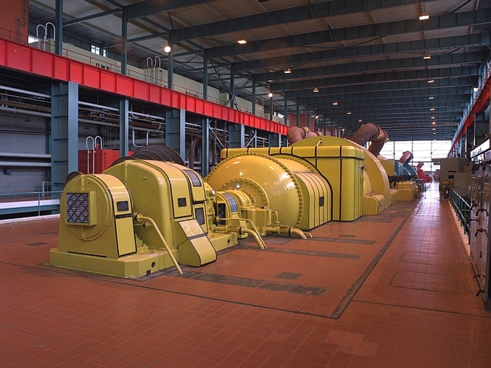 The turbine hall was 700ft long and 130ft wide and housed six 60 megawatt turbo alternators arranged longitudinally. Each comprised a duel pressure turbine driven alternator cooled by hydrogen at a pressure of 30lb per sq inch, and incorporating direct cooled rotor windings.